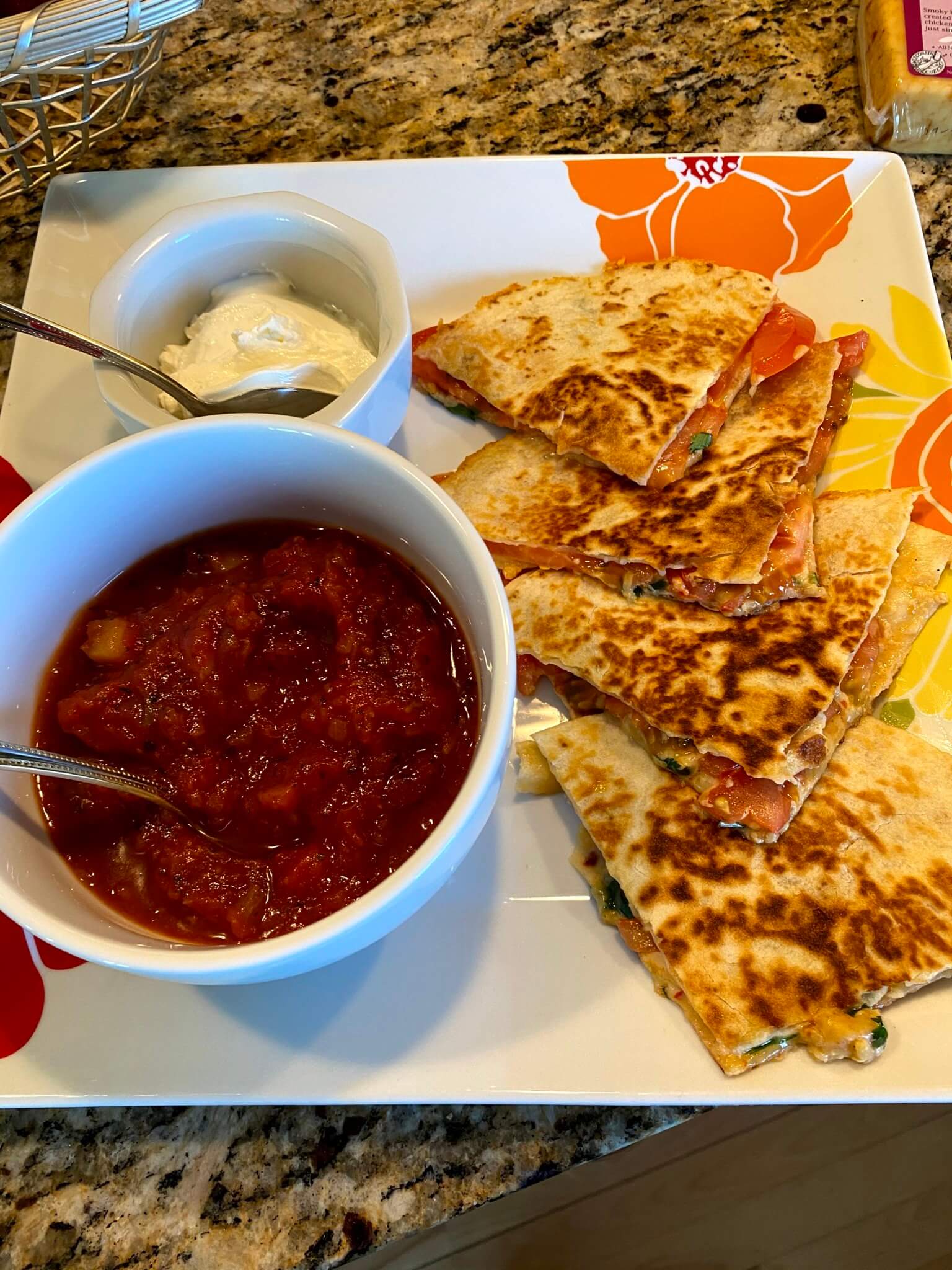 There are so many ways to make a mouthwatering quesadilla with many different combinations of fillings. One of my favorite combinations is boneless chicken, tomatoes and White Jasmine Cumin Gouda. I love how easy and simple it is to make these at any time of the day also, perfect for a summer picnic! To enhance the flavors, serve the quesadillas with sour cream and a spicy salsa.